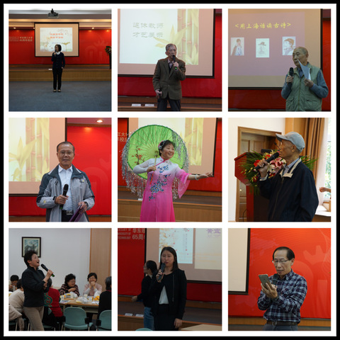 今年的敬老节活动延续往年的做法,为退休教师们提供展示才艺的舞台。适逢学校65周年校庆,节日气氛更加浓郁,退休教师们纷纷献上精心准备的节目。92岁高龄的陆昌镐为大家带来趣味文字游戏,并为大家高歌一曲英文歌曲;许士正用制作精美的幻灯片为大家带来妙趣横生的“上海话读古诗”;贾为德、顾建华和何永元分别献上歌曲《祖国,慈祥的母亲》、《北国之春》和英文版的《花儿为什么这样红》;杨凤芳和高贻敏用制作精湛的电子相册让大家领略了美国风光和美丽的大自然;朱玉兰老师深情演唱了一首《爱在2017》,并穿上秀美的民族服饰,为大家表演了青春洋溢的舞蹈《春之韵》,获得了阵阵掌声。最后,黄宜代表全体在职教师为退休教师们献唱一曲《花好月圆》,送上深深的节日祝福。